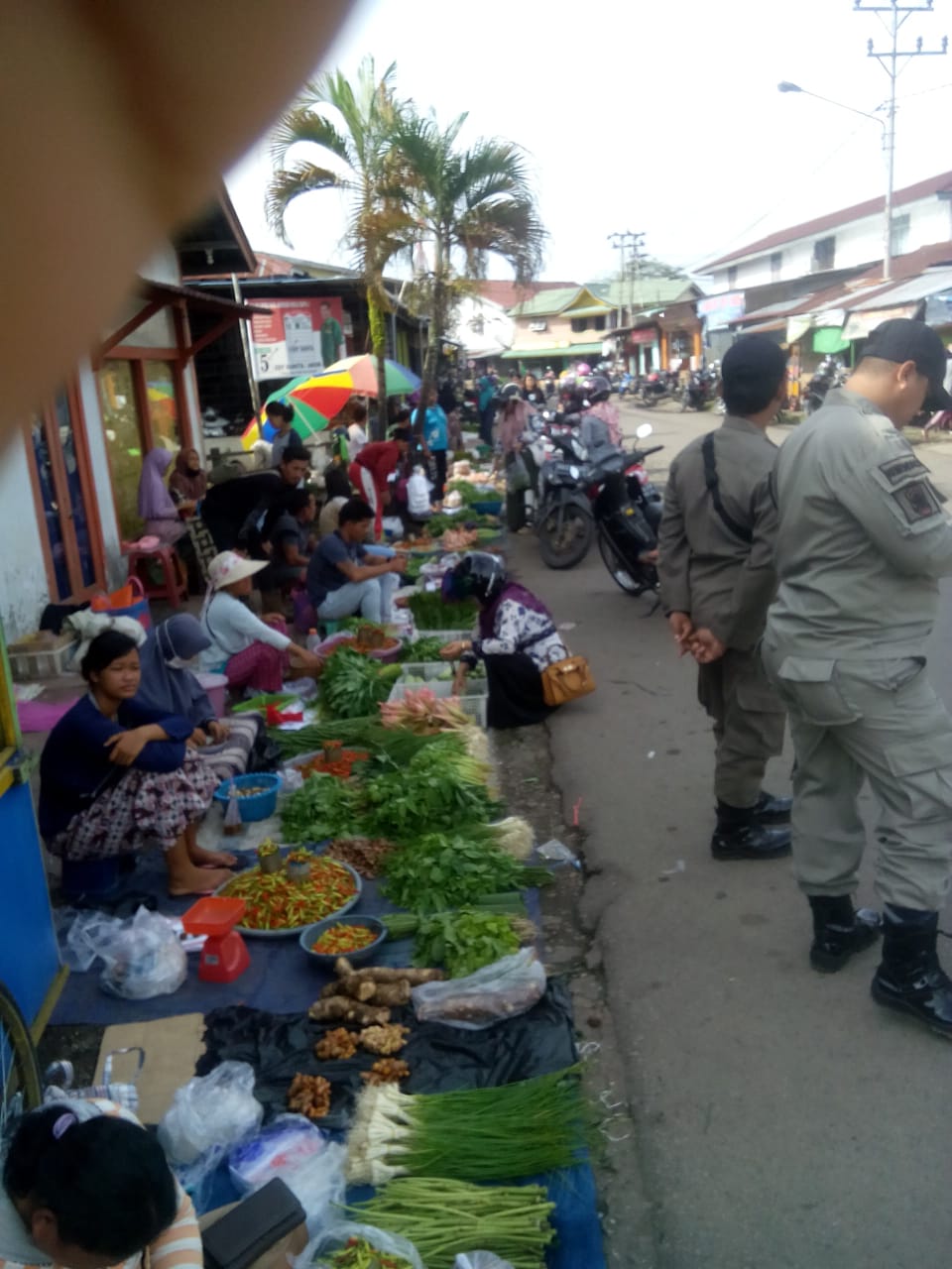 Anggota pol pp melakukan pengamanan di pasar pagi pantai sibau